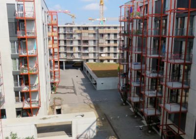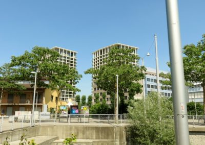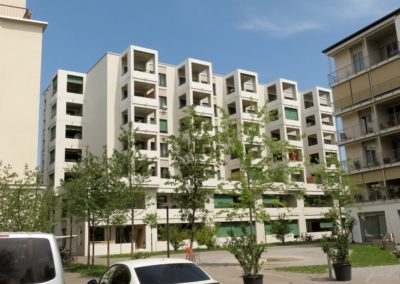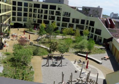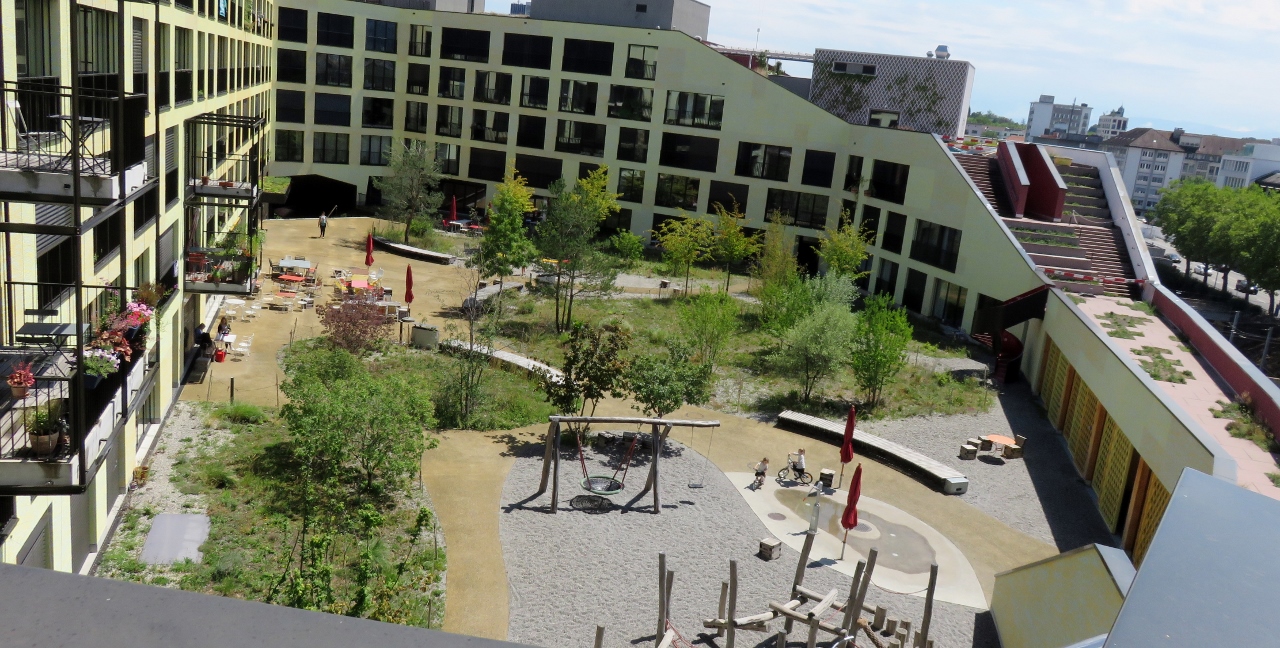 La cooperativa Mehr als Wohnen ha invece costruito tredici edifici per 403 appartamenti: da 30 a 425 metri quadrati, da una a 14 stanze. In questi spazi abitano 1100 persone e vi lavorano in 150. Anche qui ci sono negozi, gastronomia, uffici, asilo nido e pensione. Gli edifici sono stati pensati da giovani architetti che si sono messi in gioco in un concorso: i primi quattro classificati sono stati coinvolti nella loro realizzazione. Tutti i palazzi sono diversi tra loro, ma si relazionano in modo armonico su una stessa area che ha per baricentro una riproduzione fedele della piazza centrale di Zurigo. In questa zona si è concentrata una natalità così alta che il Comune di Zurigo sta costruendo una nuova scuola provvisoria.